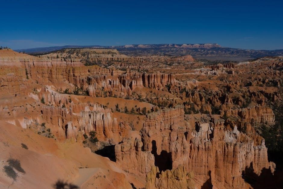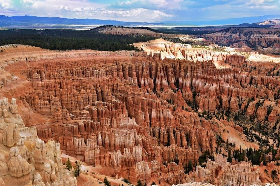 Bryce Canyon National Park‚ located in southwestern Utah‚ is a breathtaking landscape renowned for its unique geology‚ consisting of a collection of giant natural amphitheaters filled with distinctive geological formations called hoodoos. These vibrant orange‚ red‚ and white rock spires create a visually stunning panorama‚ attracting millions of visitors annually. Understanding the park’s layout is paramount for a safe and enjoyable experience‚ and a reliable map – particularly a downloadable PDF version – becomes an indispensable tool.